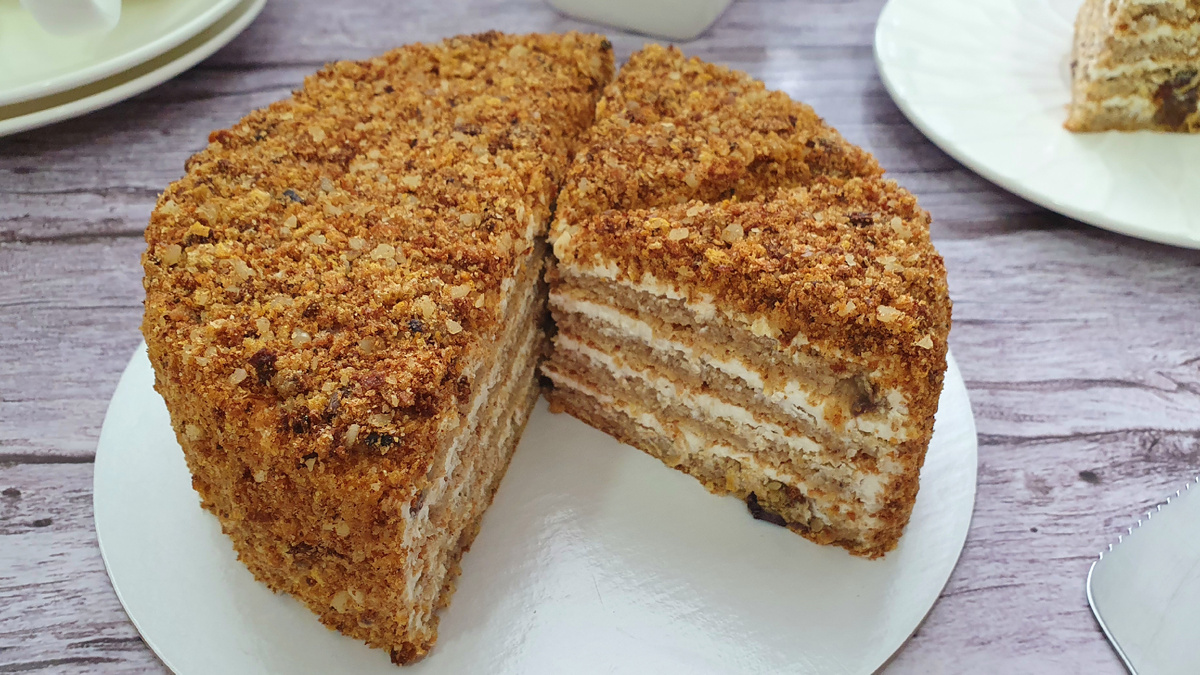 На подложку выложить первый корж, обильно смазать кремом. В прослойку можно добавлять чернослив или орехи по вкусу. Обмазать верх и бока торта кремом и обсыпать крошкой из бисквитных обрезков. Убрать в холодильник на ночь для пропитки.