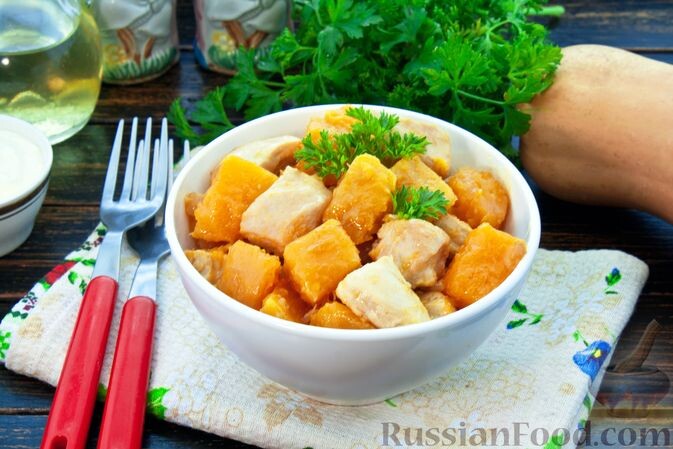 - Ингредиенты: куриные сердечки, тыква, репчатый лук, сметана, подсолнечное масло, соль, черный перец.