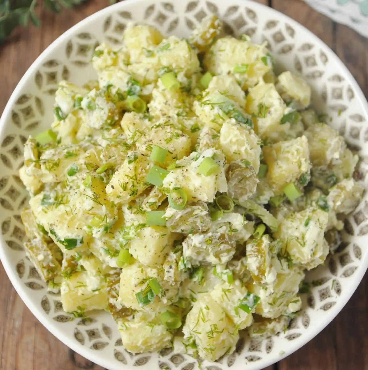 Чтобы подготовить этот сытный картофельный салат, отварите картошку в кожуре до мягкости и остудите. Затем смешайте кефир с солью, перцем и укропом. Очистите картофель, нарежьте кубиками и добавьте к составу. В завершение добавьте нарезанные огурцы и зеленый лук. Дайте настояться в холодильнике.