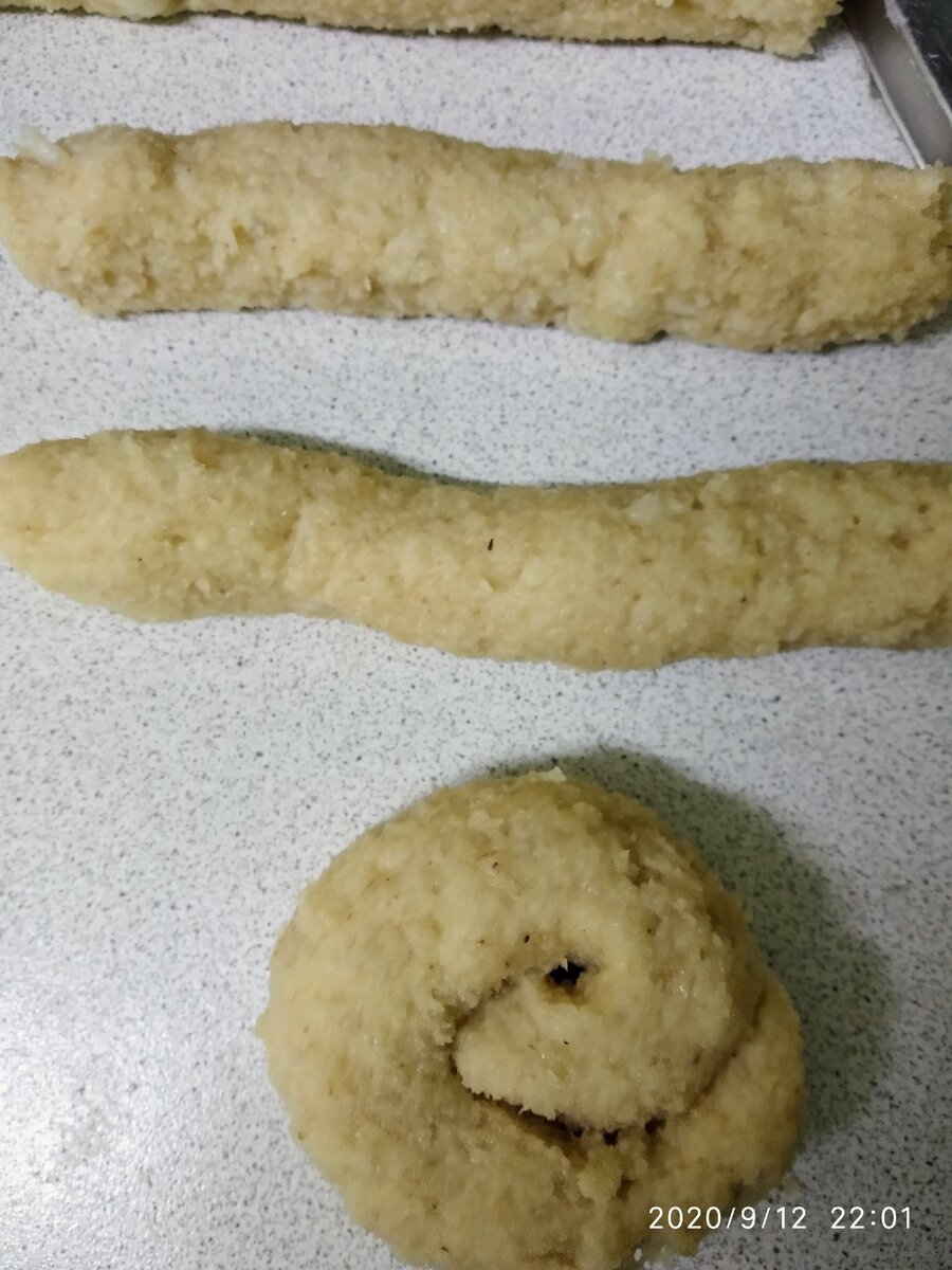 4. Разделите тесто на 9 частей и скатайте каждую в «колбаску» длиной около 20 см. Сформируйте улитки, как показано на фото.