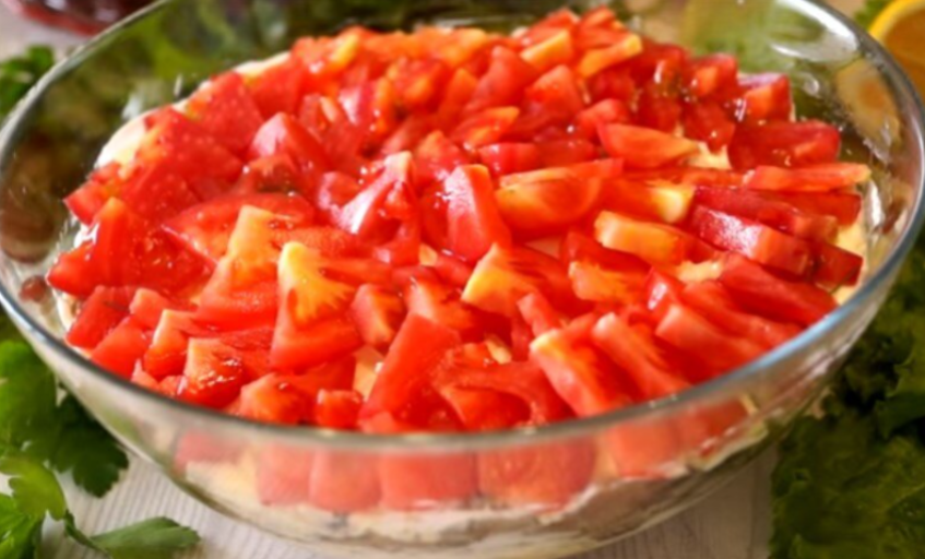 И наконец, верхним слоем кладите нарезанные помидоры, чтобы салат выглядел действительно аппетитно. По желанию можно удалить семена из помидоров, чтобы избежать лишней жидкости.