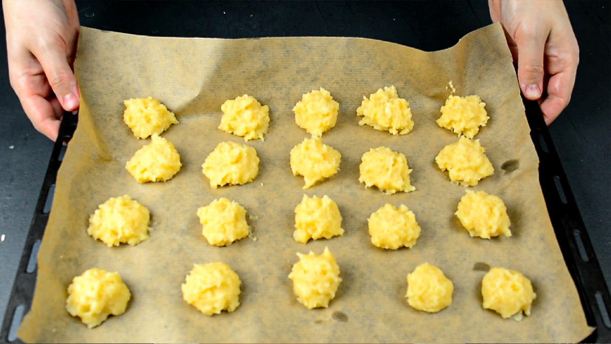 - Выложите тесто на противень, покрытый пергаментной бумагой, формируя кружочки диаметром 2–3 см.