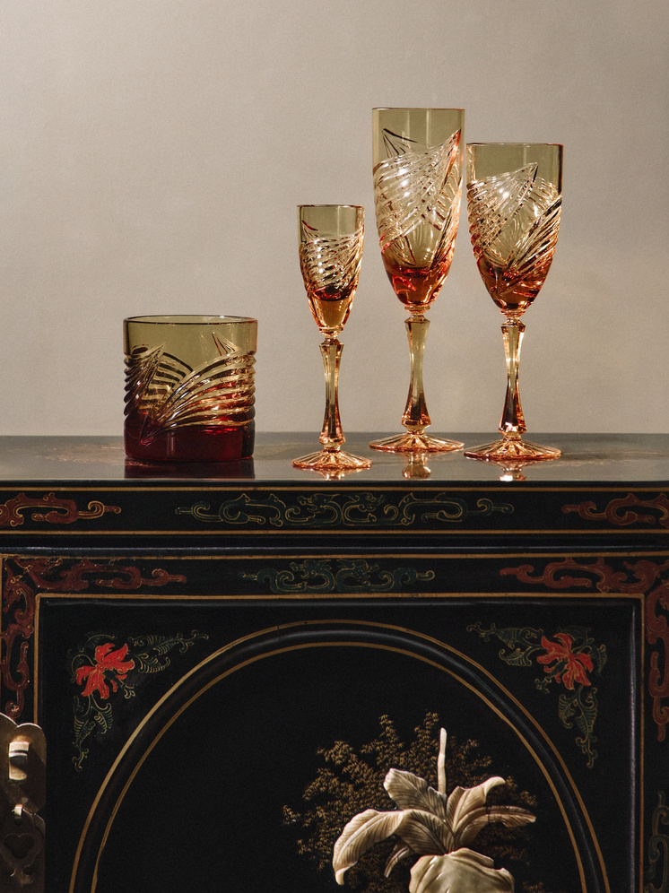 Представлена уникальная совместная работа бренда «Хохлома» и Гусевского хрустального завода — серия «Хрустальная кудрина». В этом проекте традиционные мотивы хохломской росписи обретают новую жизнь благодаря сложной алмазной грани на бокалах из янтарного стекла.