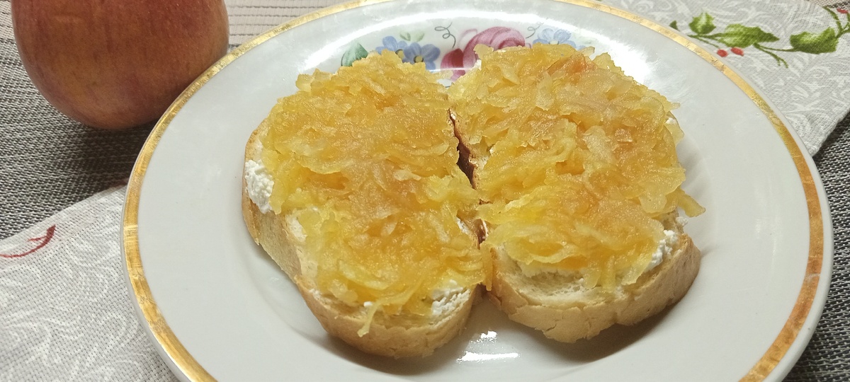 4. На каждый кусочек с творожным сыром выложите сверху карамелизированные яблоки. Наша намазка готова к подаче!