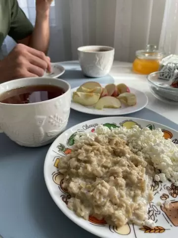 На завтрак была подана ароматная овсянка, которая подарила заряд бодрости на весь день. В дополнение к ней — нежный творог и хрустящее яблоко, создающее идеальное трио для утреннего начала.