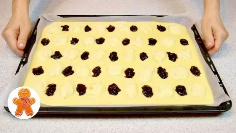 Противень застелить пергаментом, вылить тесто и равномерно распределить его по поверхности. Затем аккуратно выкладываются заварной крем и варенье. Выпекать в предварительно разогретой до 180°С духовке около 40 минут — до легкого золотистого оттенка.