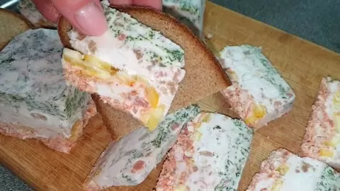 На следующий день из мороза вынимается закуска, которая будет радовать ярким и аппетитным видом. Хранить произведение кулинарного искусства следует в морозильной камере. По мере необходимости, его можно нарезать на кусочки и подавать с хлебом – такое сочетание непременно впечатлит!