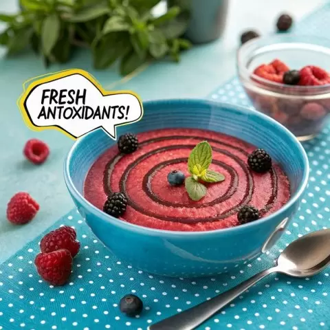 - Приготовление: В блендере смешать ягоды с водой до получения однородного пюре, добавить лимонный сок и базилик. Если консистенция слишком жидкая, охладить в морозильнике.