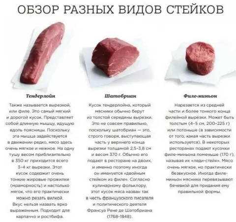 Существует множество видов стейков, каждый из которых имеет свои особенности и способ приготовления. Вот несколько самых популярных: