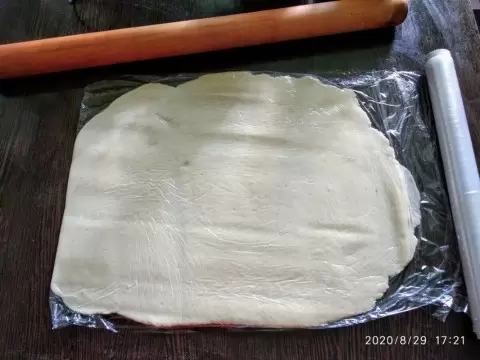 3. Раскатать охлажденное тесто между двумя слоями пленки до нужной толщины. Затем равномерно намазать его сгущенкой и аккуратно свернуть в рулет.