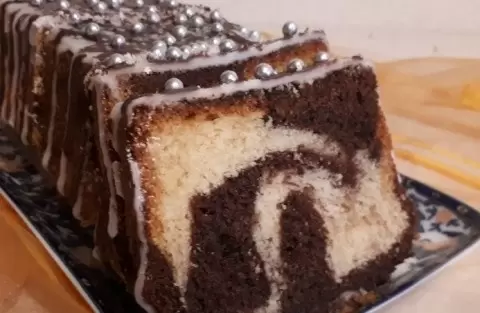 Форма для кекса (длина 25 см и ширина 9 см) подготовляется путем смазывания сливочным маслом и обсыпки манкой. Далее, белое и темное тесто выкладываются в форму, чередуя цвета. Для декоративного эффекта можно использовать вилку или деревянную шпажку, чтобы создать интересный узор.