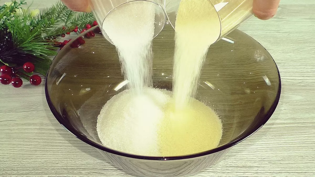 1. Начинается всё с соединения манной крупы и сахара в глубокой миске.