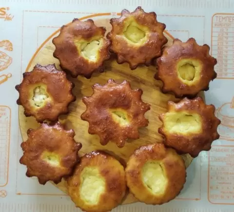 3. Когда тесто подошло, смажьте формы маслом и налейте в них тесто до половины. Затем дайте ему немного постоять на столе, а затем на каждой порции аккуратно разместите ложку сметанной начинки. Выпекайте шаньги в предварительно разогретой до 180°C духовке до готовности, проверяя деревянной палочкой.
