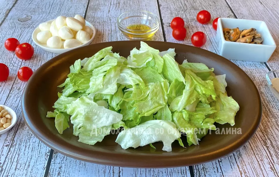 1. Листья салата айсберг тщательно промывают, затем обсушивают и рвут на кусочки, укладывая в сервировочное блюдо.
