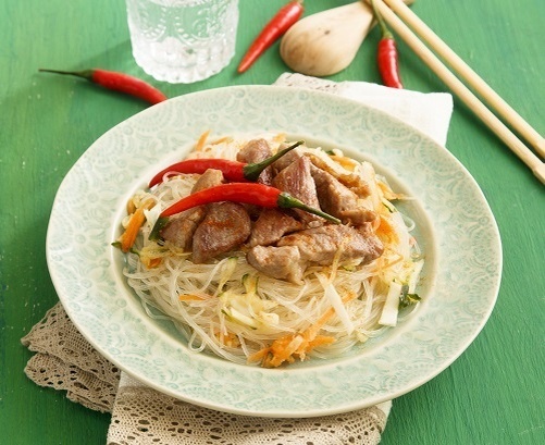 Чтобы приготовить, свинину нарезать кубиками и обжарить до золотистой корочки. Овощи натереть, а фунчозу залить кипятком на 5 минут. Для заправки смешать соевый соус, уксус и специи. На блюде выложить слоями овощи, чередуя их с лапшой, и сверху уложить мясо. Этот салат следует подавать сразу же, чтобы сохранить свежесть ингредиентов.
