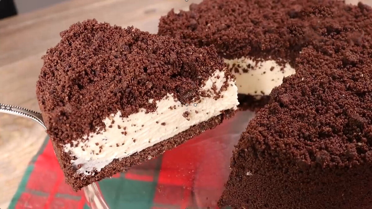 Отложите 5 ст. ложек крошки для посыпки. На блюде установите кольцо, обернув его пленкой. Сформируйте дно из печенья, хорошо прижимая. В центр выкладываем крем и аккуратно разравниваем.