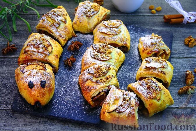 - Слоёные рулетики с яблоками, изюмом и орехами. Легкие и ароматные, эти рулетики отлично подойдут к чаю и станут изюминкой вашего стола.