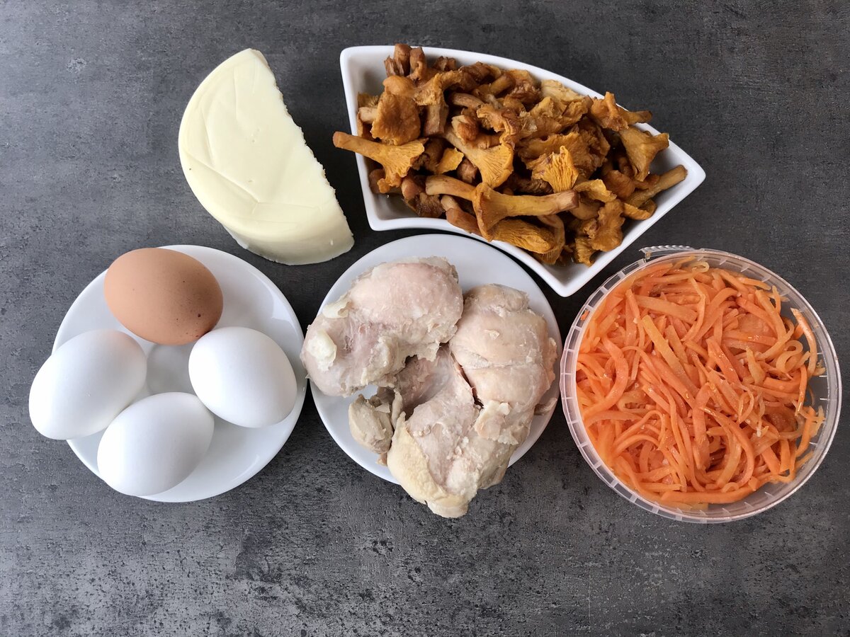 4. Яйца отварить до готовности, остудить, очистить и натереть на мелкой терке. Этот слой также необходимо покрыть майонезом, после чего следует добавить морковь по-корейски.