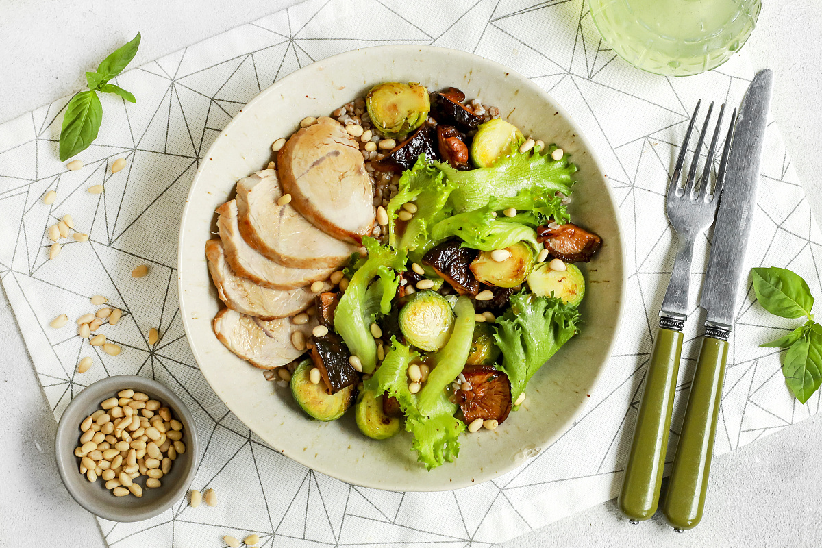 Шаг 6: Соберите боул: выложите гречку, сверху — ломтики индейки, листья салата, брюссельскую капусту и грибочки в соусе. Посыпьте кедровыми орехами, полейте соусом и подавайте к столу. Альтернативно, индейку можно приготовить на сковороде, продолжив готовить 6-7 минут, переворачивая, а затем дайте блюду отдохнуть под крышкой 7-10 минут.