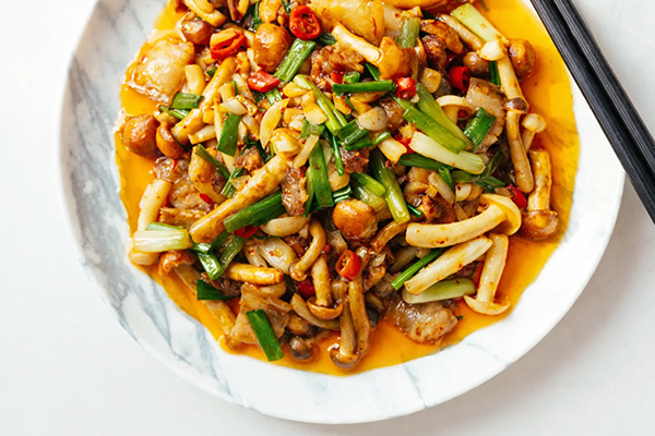 Свинина, грибы, чеснок, зеленый лук, острый перец, соевый соус и рисовое вино — вот весь набор для этого характерного блюда. В нем китайская кухня демонстрирует свою истинную сущность: вкус создается не количеством компонентов, а их верной последовательностью и техникой приготовления. Каждый элемент играет свою роль, начиная от времени жарки до момента добавления вина.