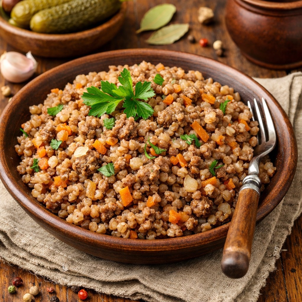 Гречневая крупа не просто гарнир; она выступает как основа, впитывающая ароматы и соки других ингредиентов. Фарш, тушёный с луком и морковью, звучит как простая, но щедрая награда для настоящего гурмана. Это блюдо отличается искренностью: без пафоса и изысков, но с уверенностью в своем вкусе, что спорить с ним бесполезно. Оно символизирует сытость, тепло и ощущение домашнего уюта, возникающее при встрече с любимой едой после долгого дня.