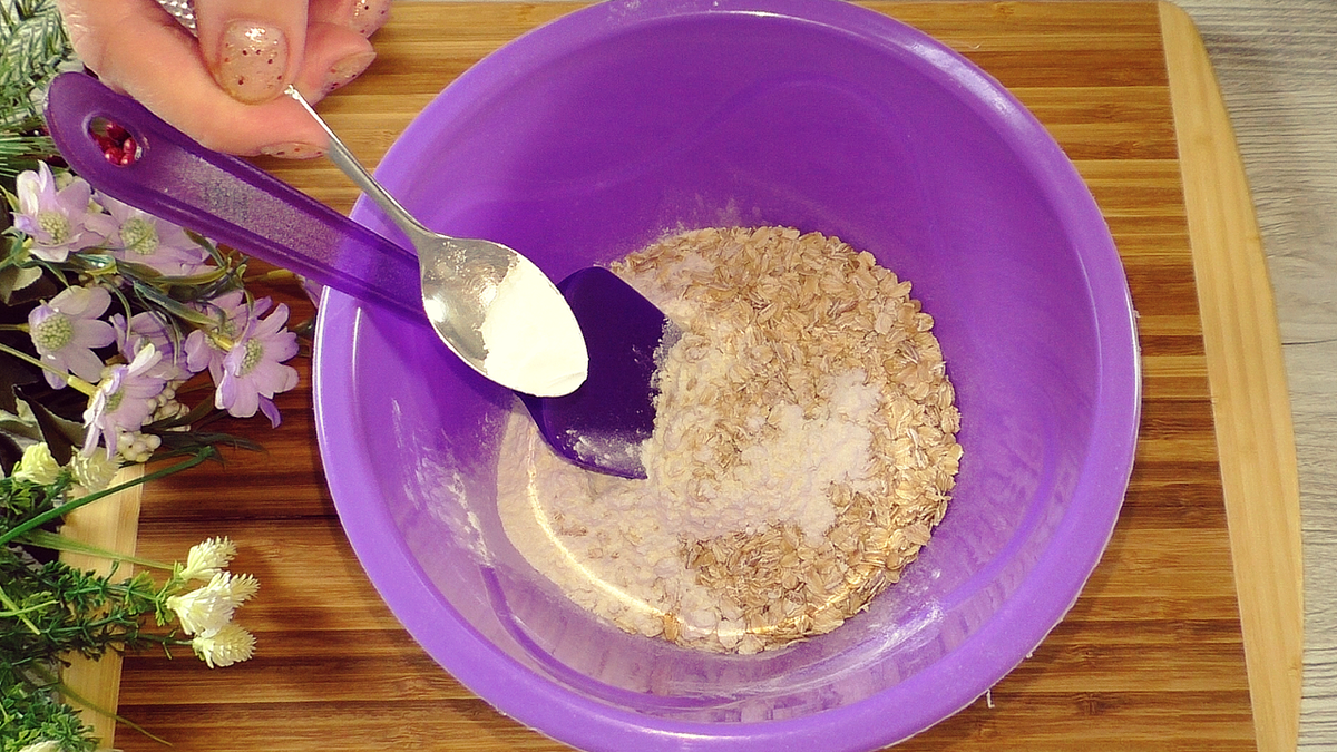 В начале процесса необходимо соединить овсяные хлопья и муку в равных пропорциях, добавив разрыхлитель. Все тщательно перемешивается и откладывается в сторону.