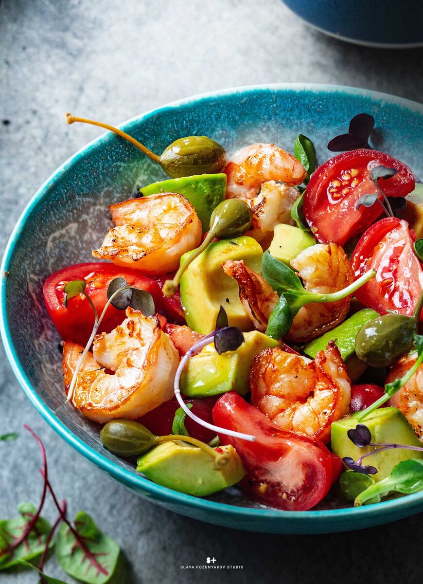 Немаловажным аспектом является и ракурс съемки. Для наилучшего представления блюда рекомендуется фотографировать под углом 45 градусов или сделать снимок сверху (flat lay). Съемка под углом 45 градусов поможет выделить объем, слоистость и текстуру ингредиентов, придавая объекту выраженность. С другой стороны, снимки сверху идеально подходят для демонстрации красивой раскладки салата в плоских мисках и тарелках.