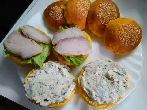 Бутерброды на тыквенных булочках с рыбным паштетом и запечённым свиным окороком.