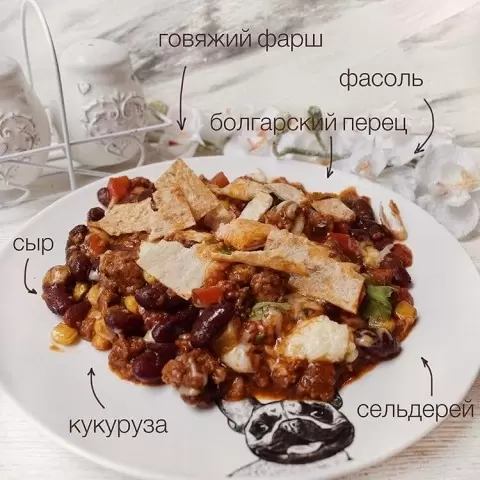 Готовое чили кон карне сервировать горячим, посыпанным сыром и украсить чипсами из лаваша при желании. Это блюдо хорошо дополнить рассыпчатым рисом басмати, картошкой в мундире или кускусом. К чили кон карне хорошо подойдет натуральный йогурт и свежие дольки лайма.