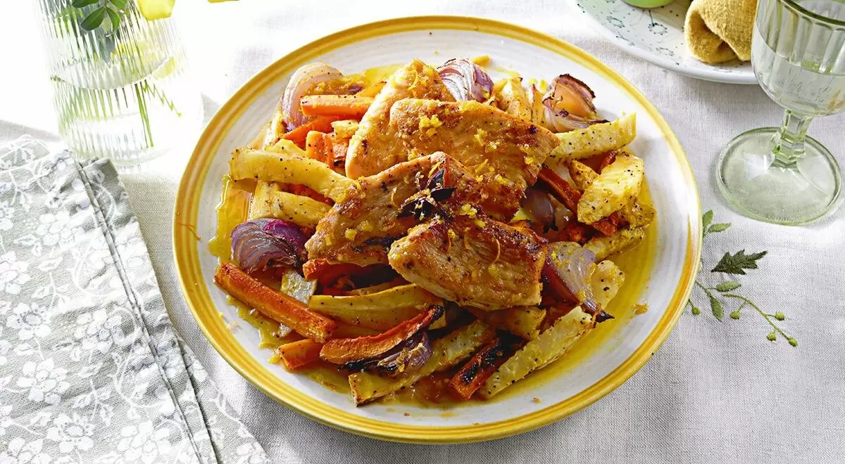 Шаг 2: Разогрейте духовку до 180 °C. Лук нарежьте перьями, а морковь, пастернак и сельдерей – крупной соломкой. В жаропрочной форме смешайте овощи с солью, перцем, оставшейся цедрой и 3 ст. л. растительного масла. Запекайте при температуре 180 °C около 25–30 минут до золотистого цвета.