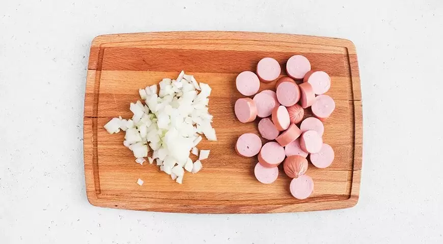 Чтобы начать готовить гречку с сосисками, следует подготовить все необходимые ингредиенты. Рекомендуется сначала промыть гречневую крупу, используя сито, чтобы избавиться от лишнего крахмала. Дайте воде полностью стечь. В это время сосиски необходимо очистить от оболочки и нарезать их кружочками толщиной примерно 0,5–1 см. Лук нарежьте мелкими кубиками, чтобы он быстрее обжарился.