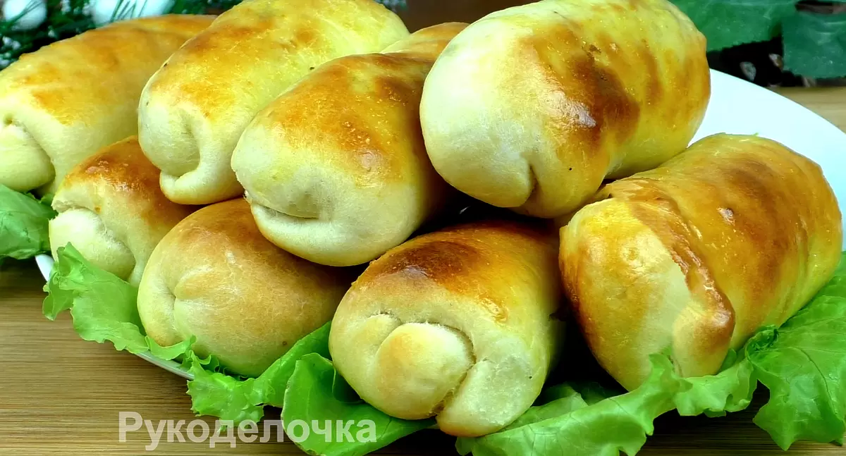 Готовое тесто разделяется на 15-18 частей. Из каждой части раскатывается лепёшка, в которую добавляют начинку и сворачивают в трубочку. Пирожки выкладываются на противень, смазываются яйцом и запекаются в разогретой духовке при 200 градусах около 15 минут. Готовьте на свой вкус и пробуйте разные начинки!