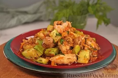 - Курица с кабачками: Нежные кусочки куриного филе, обжаренные до золотистой корочки, потом тушатся с молодыми кабачками, морковью и луком. Сочетание свежих овощей и ароматов делает это блюдо легким и изысканным.