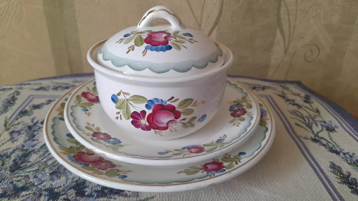 Сахарница также в отличном состоянии с клеймом, датируемым 1974 годом. Большая тарелка имеет диаметр 20 см, а маленькая — 17 см. Все бы было прекрасно, если бы не мелкие жёлтые точечки на маленькой тарелке, которые свидетельствуют о её возрасте. Эта тарелка теперь станет частью моей коллекции, так как дочь, следуя своему перфекционизму, не примет даже малейших дефектов.