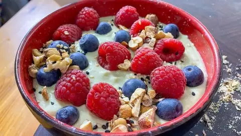 Перелейте смесь в пиалу и украсьте сверху ягодами малин и голубики, а также посыпьте крупно порезанными орехами и жареным кунжутом. Ваша глэм-завтрака готова!