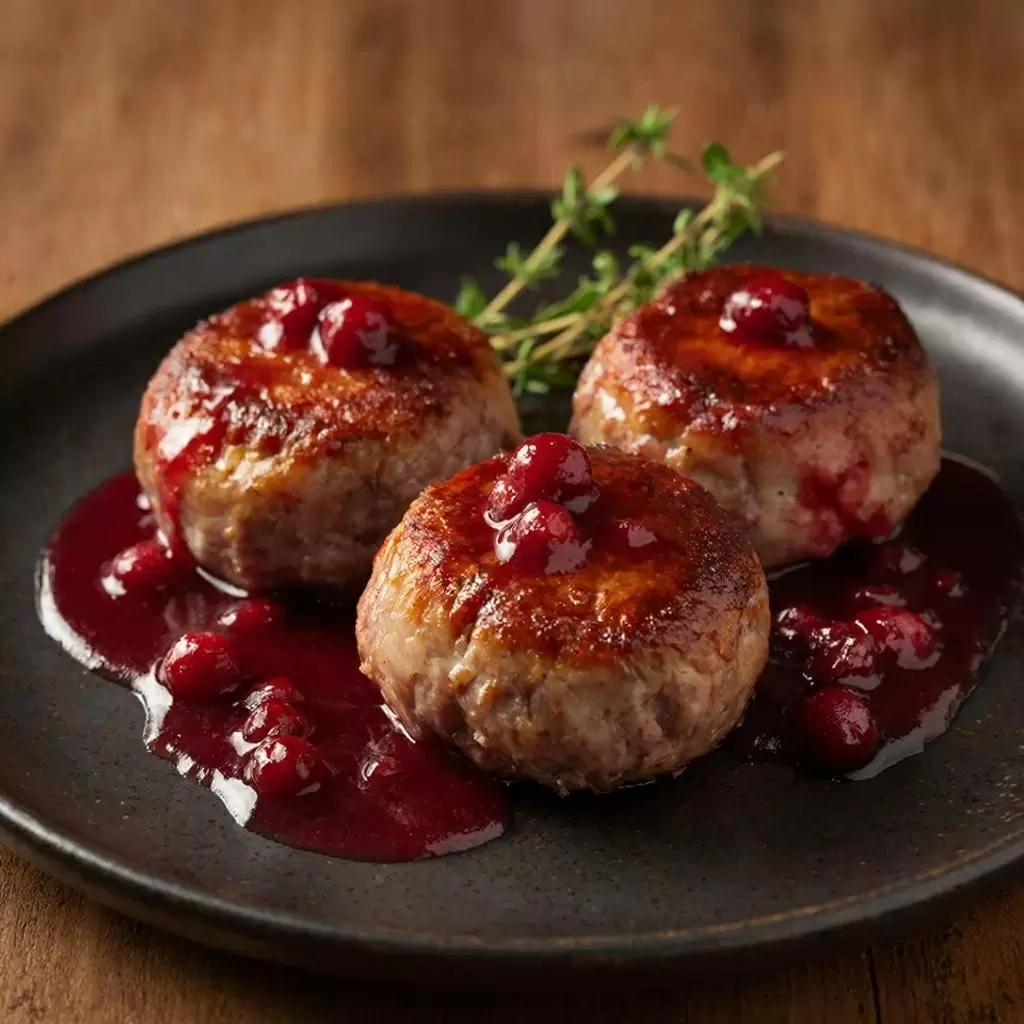 Подавайте биточки с печёным картофелем, пюре из сельдерея или ризотто. Соус добавьте щедро, чтобы создать гармоничную композицию на тарелке. Для украшения подойдут свежий тимьян, розмарин и несколько ягод.
