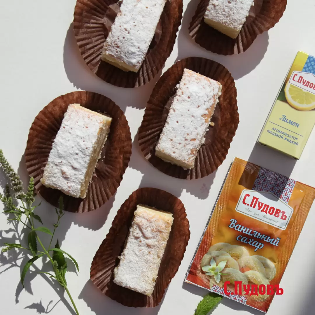 5. Затем нарежьте на порционные квадраты и выложите на бумажные формочки. При подаче, по желанию, можно присыпать сахарной пудрой.