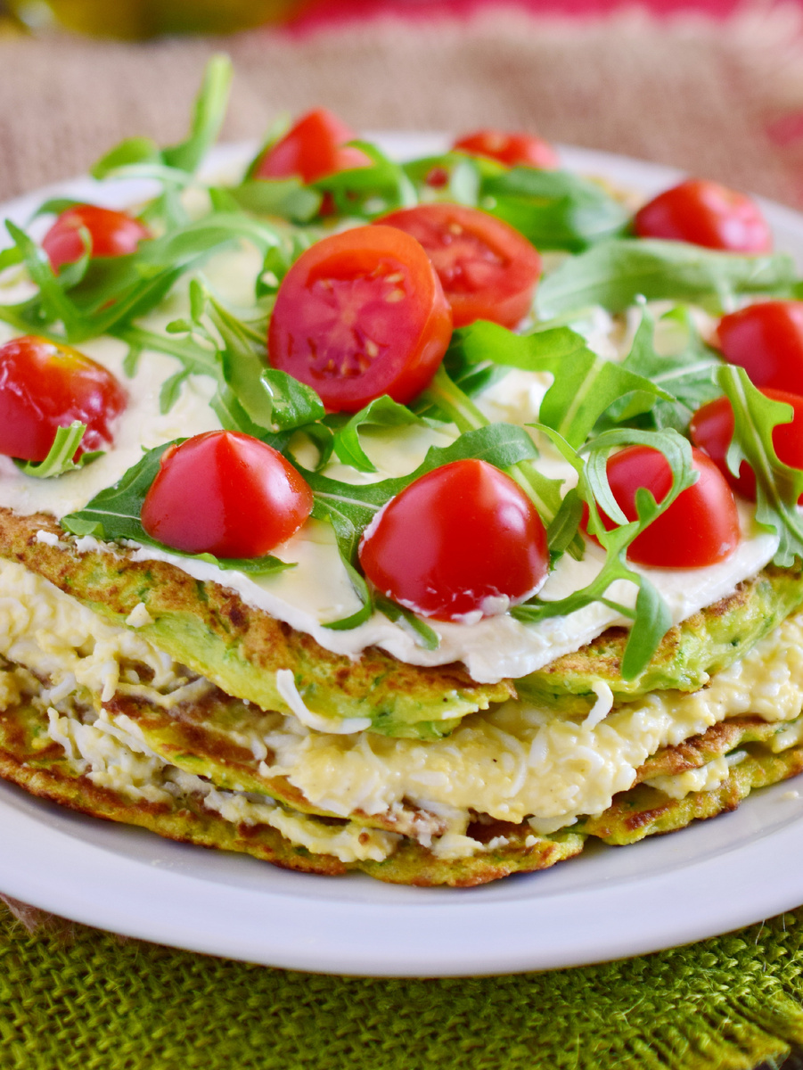 На первом кабачковом блинчике равномерно распределить половину начинки, затем накрыть вторым блинчиком и добавить оставшуюся начинку. Последний блинчик украсить майонезом для презентации. Завершить оформление можно руколой и половинками помидоров черри.