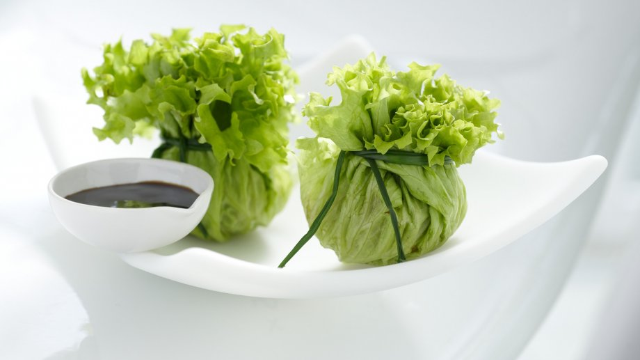 5. Выложите начинку на листья с небольшими порциями кешью. Заверните в форме мешочка и зафиксируйте зелеными стеблями лука. Servir с соусом Хойсин и наслаждайтесь свежим вкусом!