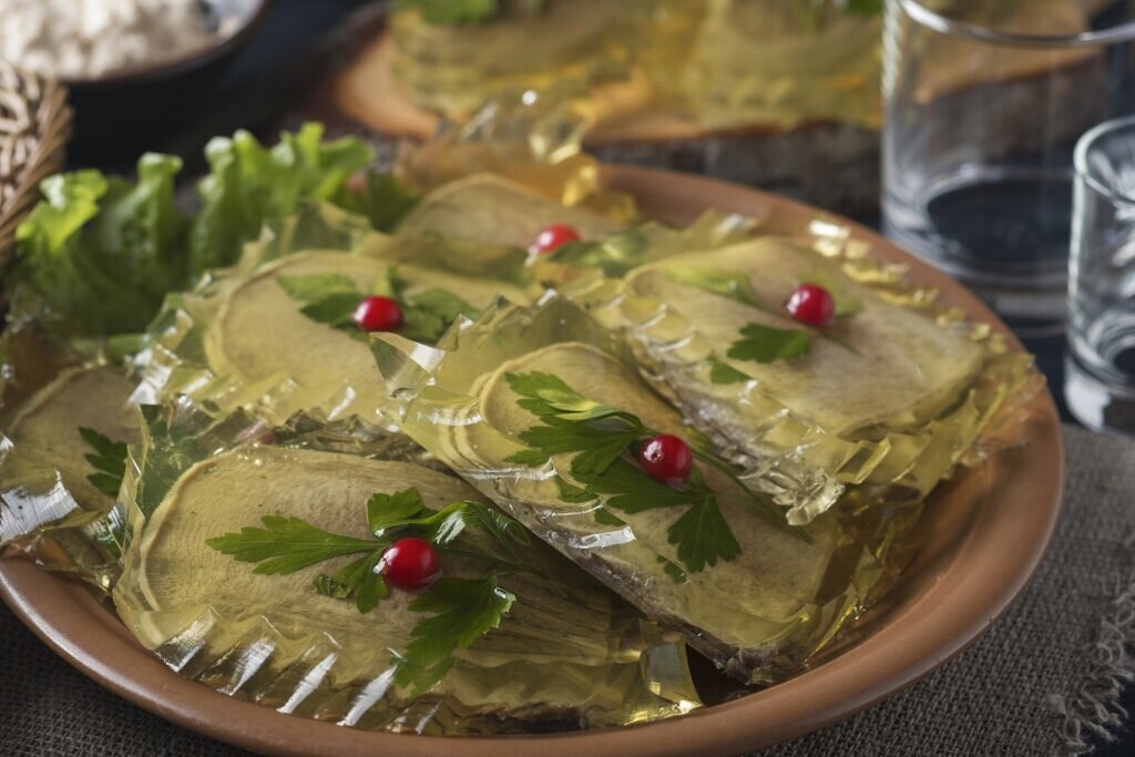 Уберите блюдо в холодильник на три часа. Как только время пройдет, заливное можно подавать к столу с горчицей или хреном.